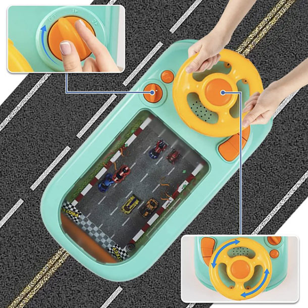 Fun Toy симулаторот на тркање нуди искуство на возење со 2 брзини, правејќи ја секоја трка уште поинтересна! Вашето дете може да избере помеѓу пониска и повисока брзина, учејќи како да ја контролира играта и уживајќи во секој „свиреж“ и „правец“.