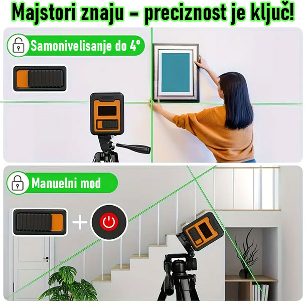 > Manualni režim – za dijagonalna poravnanja, idealno kod stepeništa ili specifičnih instalacija