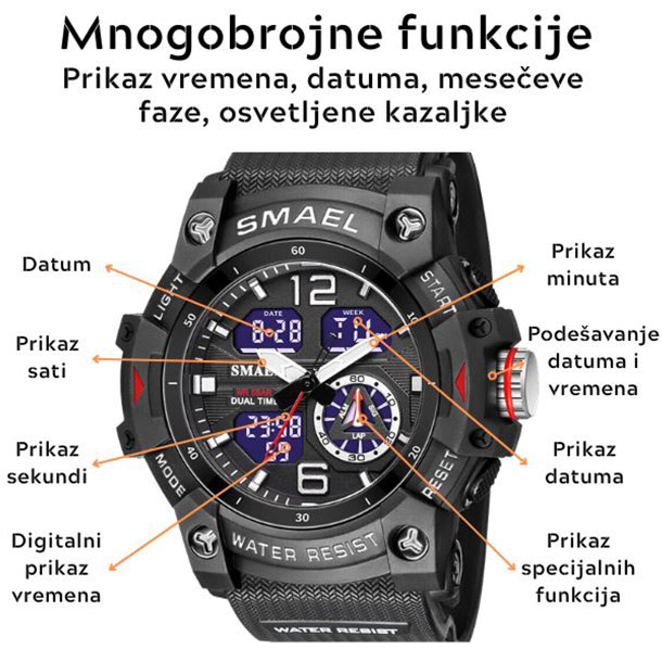 Ovaj fantastični sat odlikuje moćan i robustan dizajn, vrhunske performanse, izuzetna udobnost, vodootpornost, mnogobrojne korisne funkcije, te visokokvalitetni materijali i premium izrada.